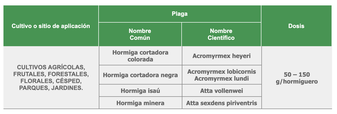 Folidol F Granulado es un insecticida que controla todo tipo de hormigas en cultivos agrícolas, frutales, forestales. Su acción es por contacto y/o ingestión. Interfiere en la transmisión GABA (ácido gamma amino butírico) sobre los iones cloro, en el sistema nervioso central.
